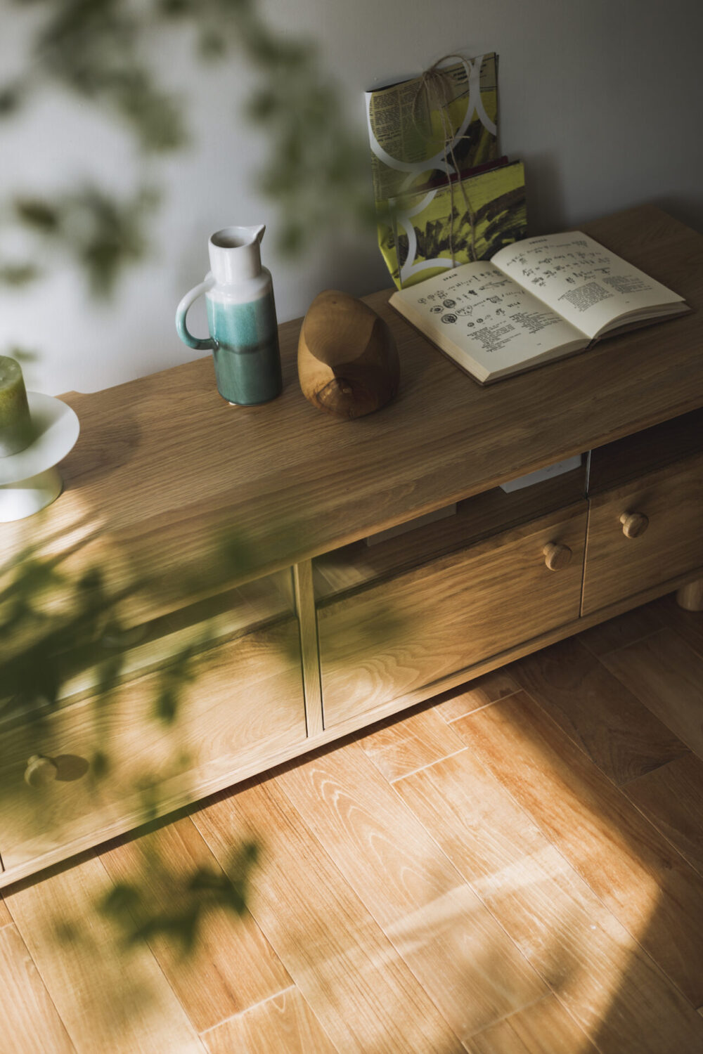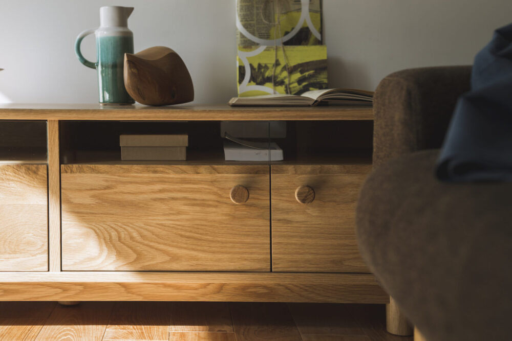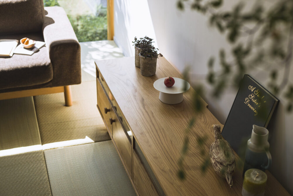 窓を開けると大容量の収納となっており、たくさんのメディアや小物を収納できます。